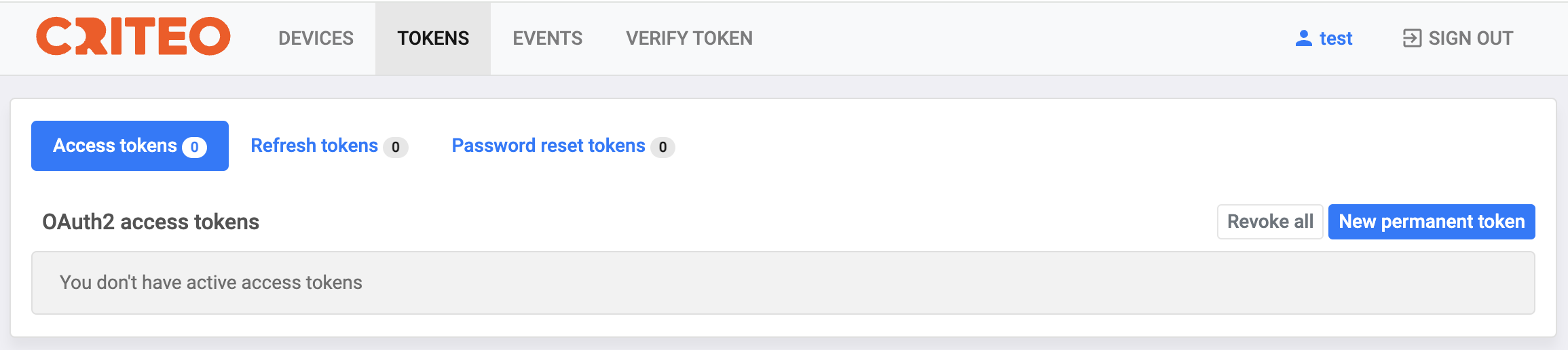 • Click the New permanent token button in the appeared dialog box with the list of available tokens. This list is empty, if you are creating your first token.