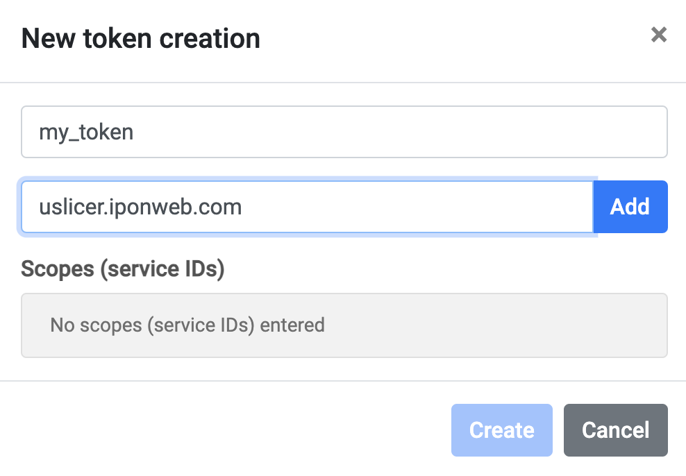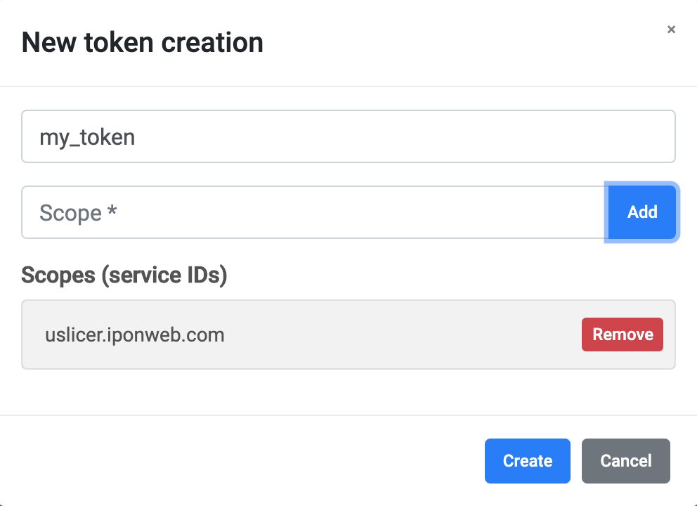 • Enter token Name and Scope (uslicer.iponweb.com) in the appeared New token creation dialog box.