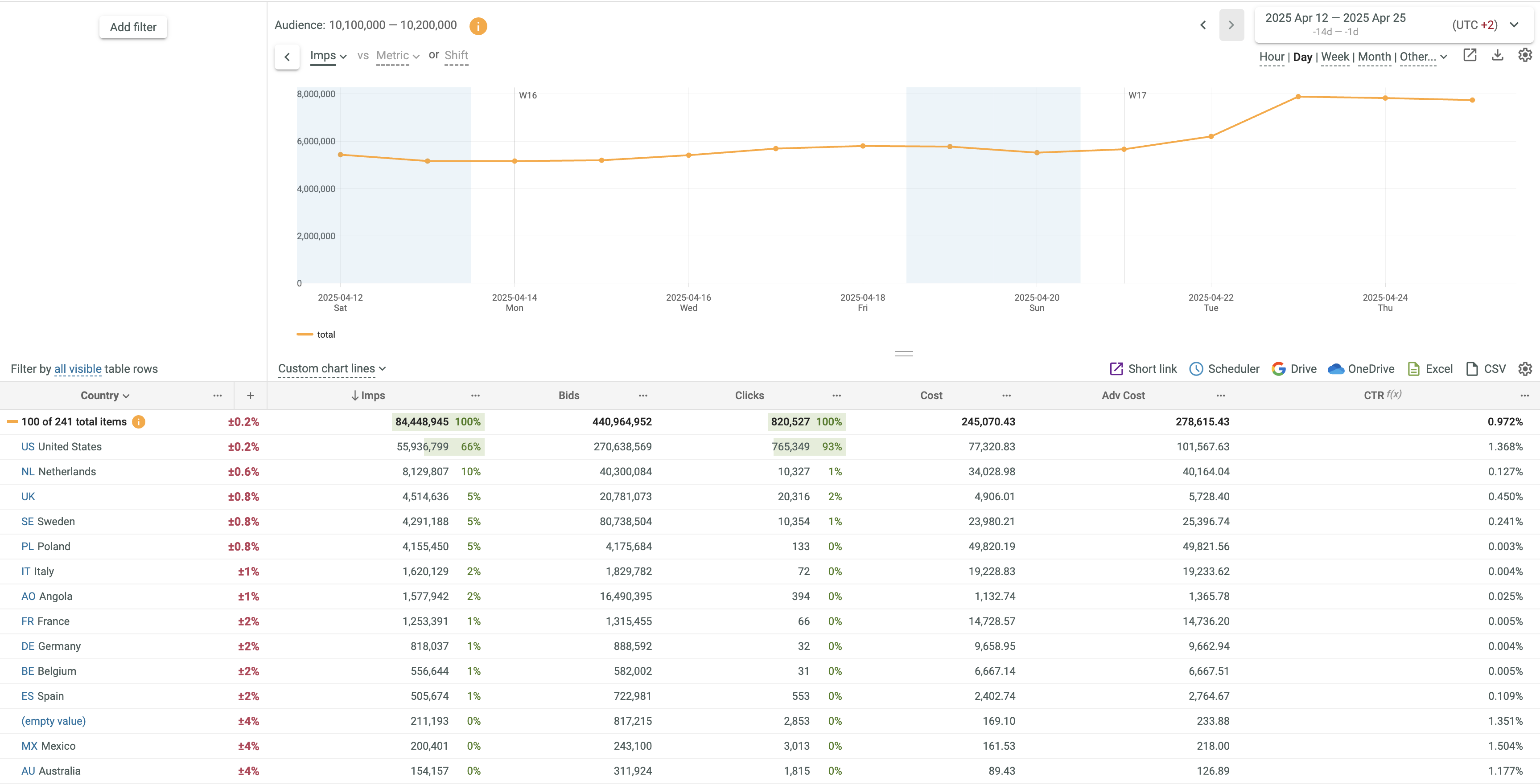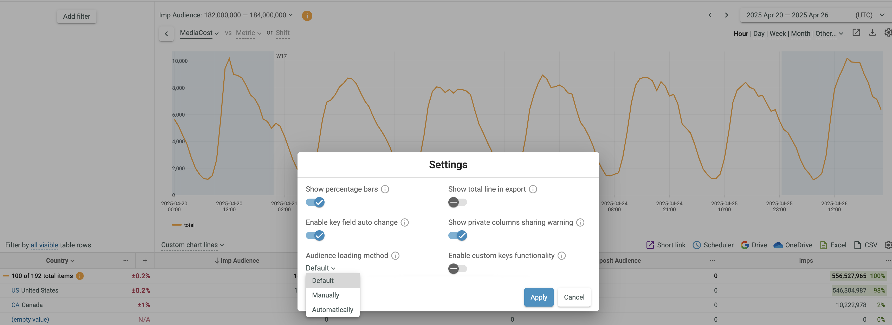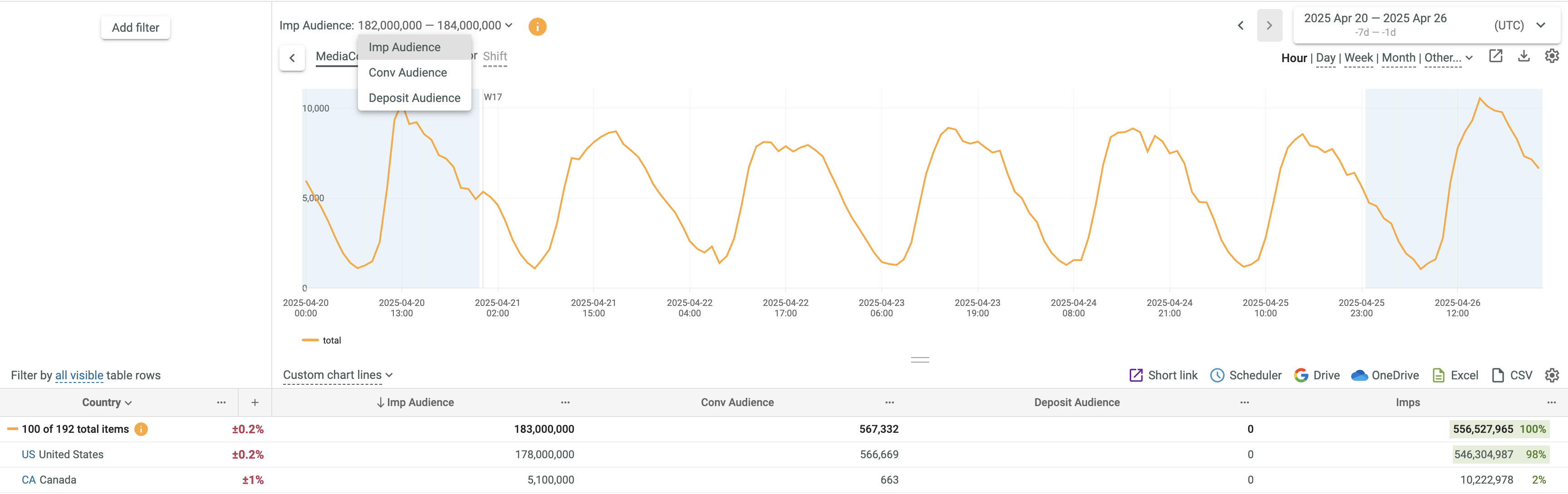 u-Slicer can display Audience from several sources (Imp Audience, Conv Audience and Deposit Audience in this example) simultaneously.